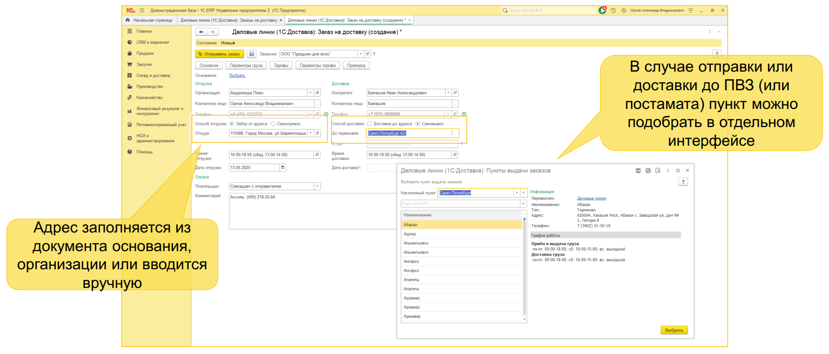 В заказе необходимо выбрать населенный пункт. Он подгружается в 1С из сервисов СДЭК. И нужно подобрать адресные данные либо отправления и получения груза, либо пунктов приема-выдачи заказов.