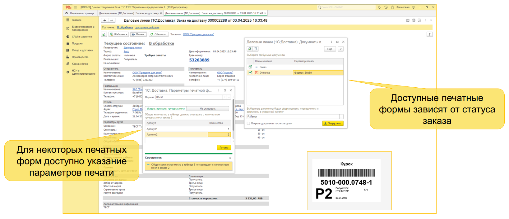 Для «Деловых линий» в зависимости от статуса набор печатных форм меняется. Но также можно распечатать этикетку и отправить данные клиенту.