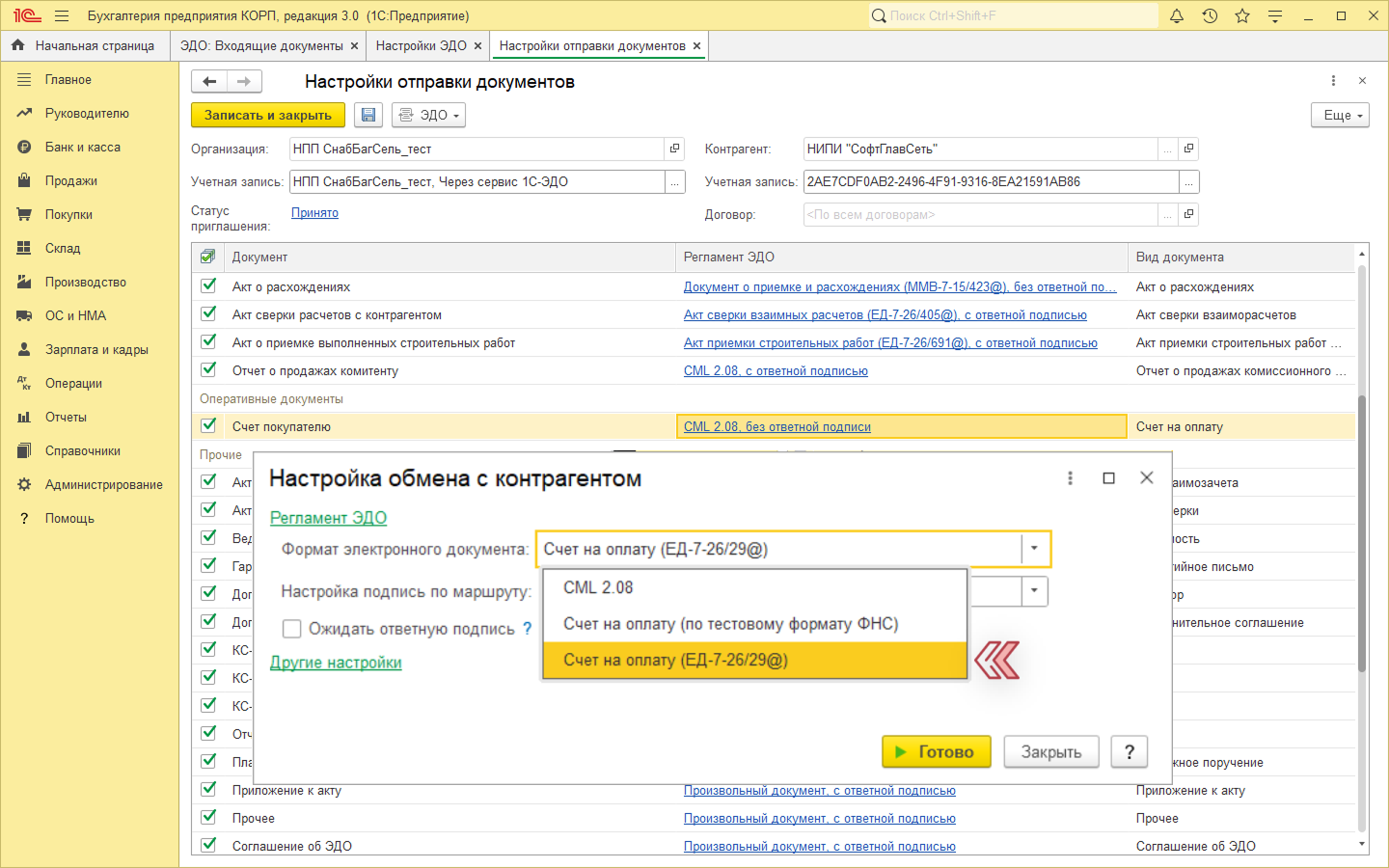 Даже если ваша компания полностью перешла на УПД 5.03, контрагенты могут продолжать отправлять документы по устаревшим форматам 551 и 552. Чтобы избежать сбоев в работе, важно административно согласовать переход с партнерами и изменить настройки обмена документами. Для этого в 1С-ЭДО удобно использовать инструменты массовой обработки, такие как массовая смена настроек, массовая рассылка соглашений и информационных писем.