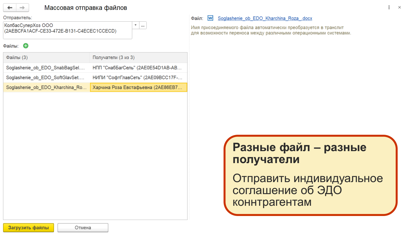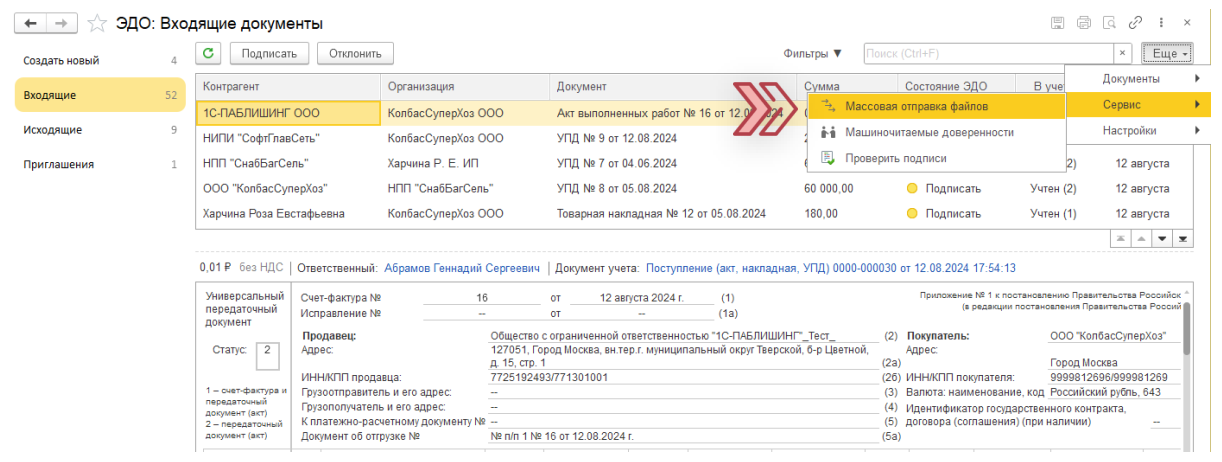 Если требуется отправить индивидуальные соглашения и информационные письма, 1С‑ЭДО также поддерживает массовую обработку: