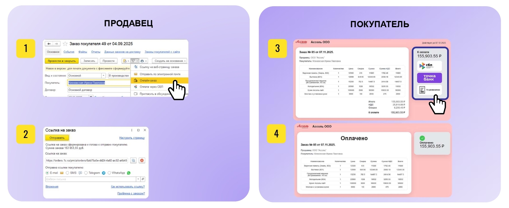 - Ссылка отправляется покупателю по электронной почте, в SMS, через мессенджер или другим способом.