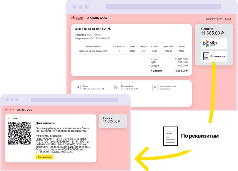 Преимущества для покупателя-юрлица. Прежде всего — удобная оплата по ссылке из системы дистанционного банковского обслуживания (ДБО). При этом способе не нужно заполнять «платежку», все реквизиты платежа загружаются автоматически по ссылке. И большой плюс — быстрое зачисление денег на счет продавца, без задержек, как при стандартных переводах.