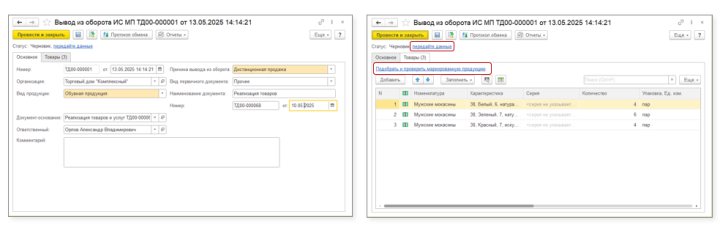 После передачи в доставку необходимо вывести товар из оборота, оформив документ «Вывод из оборота ИС МП»: Продажи — Сервис — Обмен с ИС МП (Обувь, одежда, табак…) — Продажи — Вывод из оборота ИС МП.