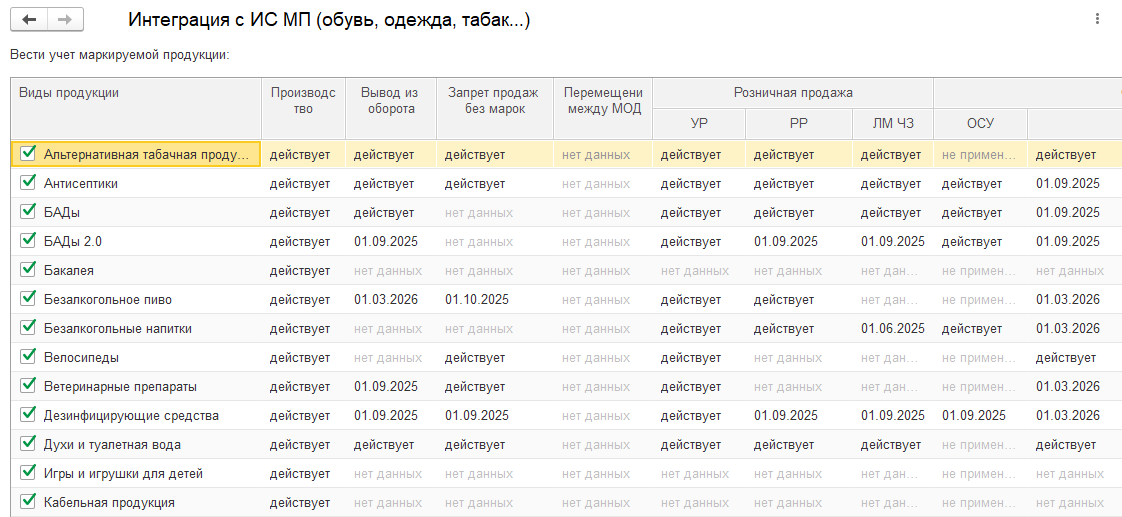 5. Убедитесь в готовности программы 1С к работе с маркировкой. Проверьте: