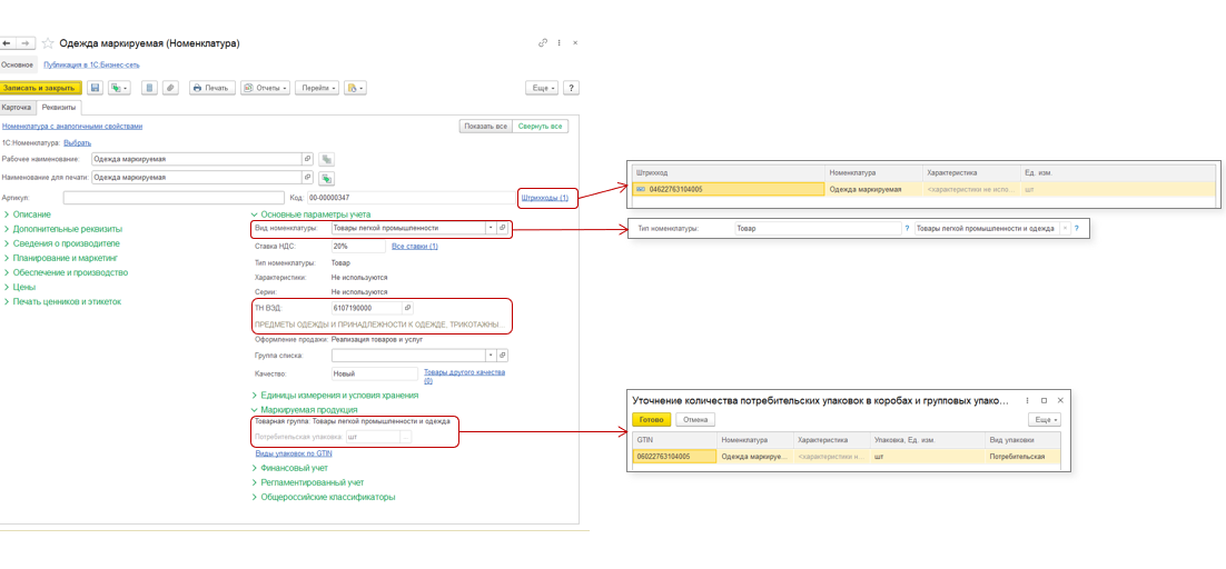 В прикладных решениях 1С (1С:УТ, 1С:КА, 1С:ERP) коды ТН ВЭД и GTIN указываются в карточке номенклатуры. В частности, GTIN указывается по ссылке «Штрихкоды».