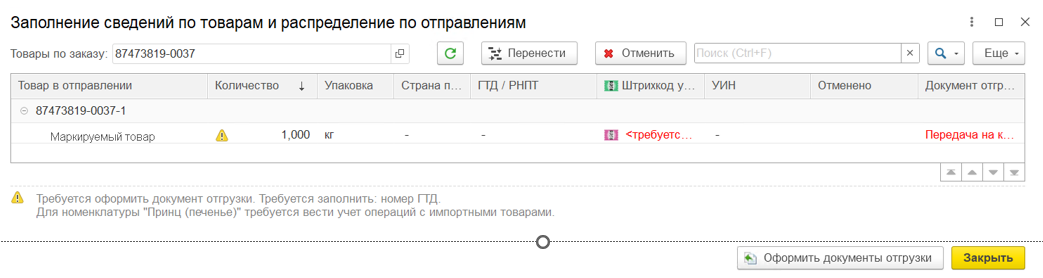 Указание кодов маркировки при отгрузке — часть типового сценария работы. Коды необходимо отражать в документах отгрузки — «Реализация товаров и услуг» или «Передача на комиссию», а если используются ордерные склады, — в «Расходном ордере на товары». Для ордерных складов отгрузка выполняется в рабочем месте Склад и доставка – Ордерный склад – Отгрузка.