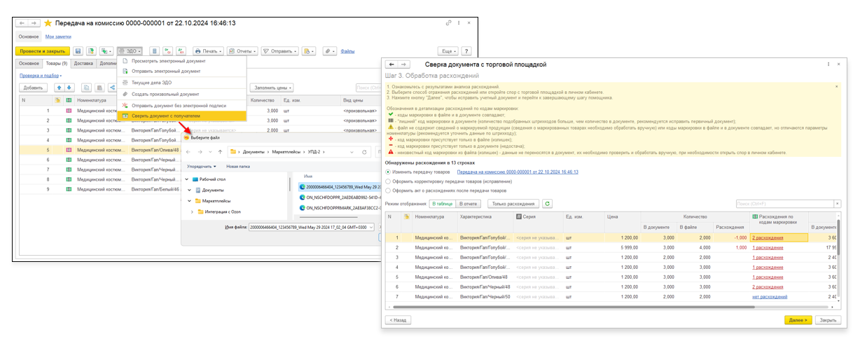 Коды маркировки сохраняются в информационной базе продавца в документах отгрузки «Передача на комиссию», для ордерных складов — в «Расходных ордерах на товары». В систему маркировки «Честный знак» коды не передаются до подтверждения приемки товара маркетплейсом.