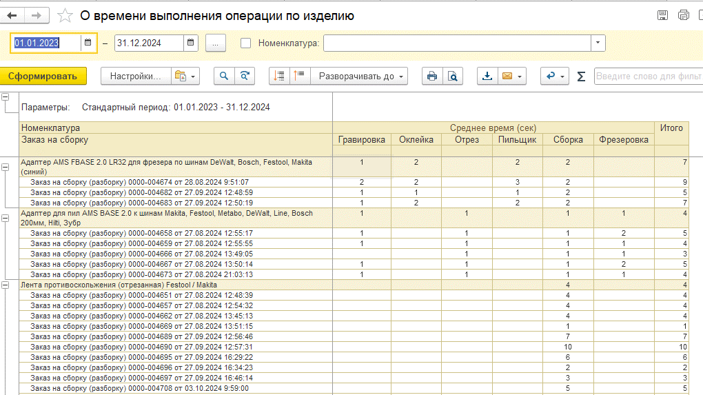 - О времени выполнения операции по изделию (по номенклатуре);