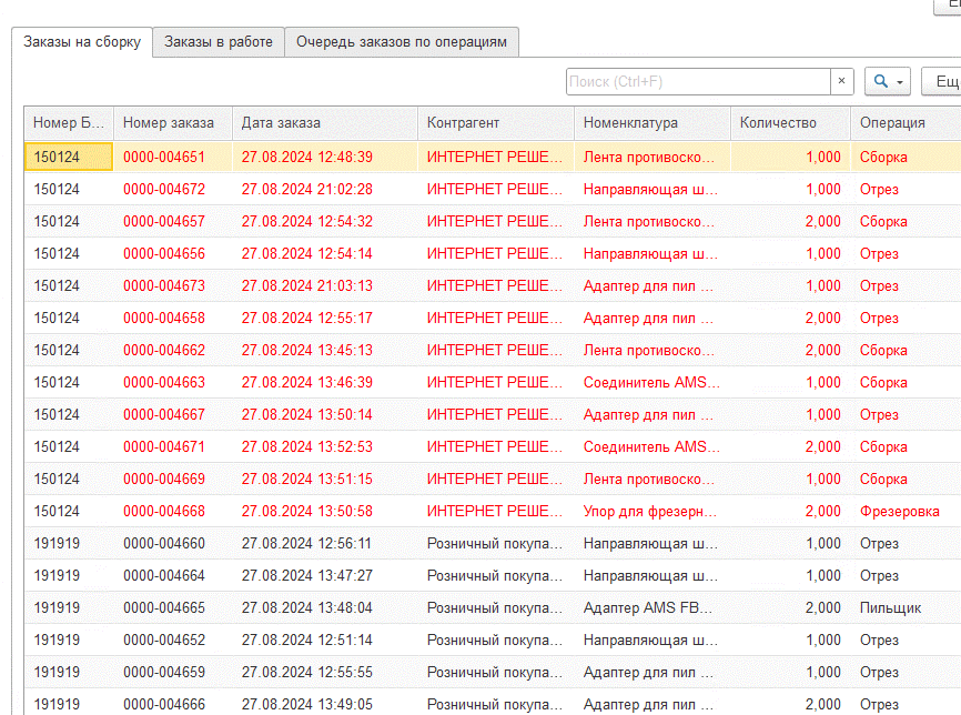 Заказы на сборку включают несколько изделий и формируют очередь для обработки производством. По каждому производимому изделию выводится информация о выполняемых операциях. Виды и последовательность операций определяются в карточке номенклатуры и переносятся в документ «Комплектация товара».