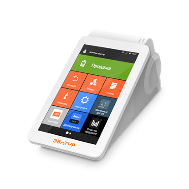 Конструкция терминала объединяет в себе блок печати чеков и сенсорный дисплей с предустановленным кассовым ПО на базе ОС Android. Программных возможностей Эвотор 7.3 достаточно, чтобы вести торговую деятельность: выполнять основные кассовые операции, вести товароучет и готовить отчетность.