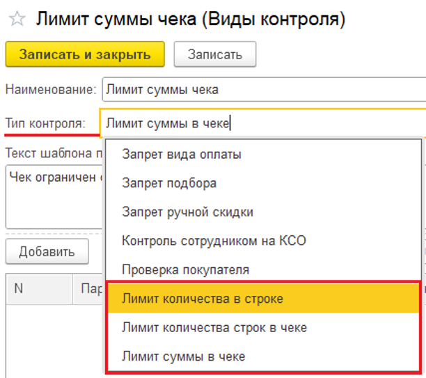 - Лимит количества в строке - продажа возможна, если в строках чека количество конкретного товара не превышает значения, указанного в виде контроля.
