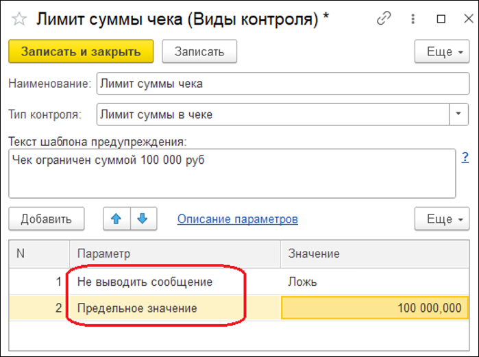 - Лимит суммы в чеке - общая сумма чека к оплате не должна превышать указанного лимита в виде контроля.