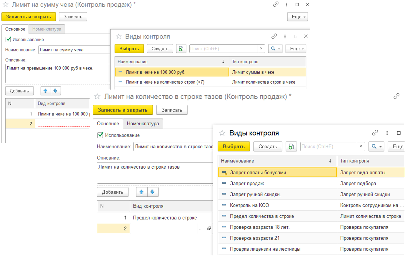 Теперь элемент справочника «Контроль продаж» может содержать одновременно только виды контроля, относящиеся либо к строкам товаров, либо ко всему чеку. Доступные к добавлению виды контроля зависят от первого выбранного вида контроля.