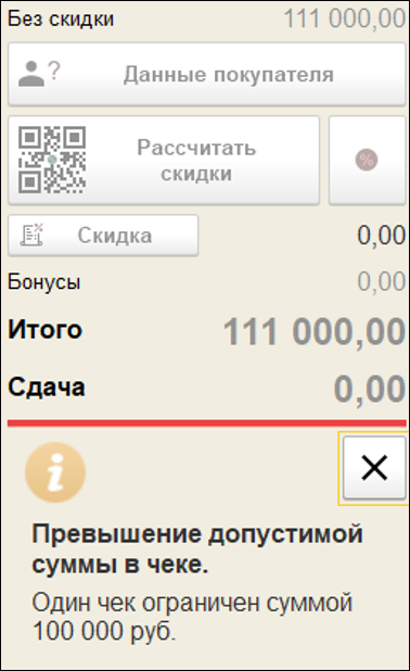 - Лимит количества строк в чеке - общее количество позиций в чеке не должно превышать указанного лимита в виде контроля.